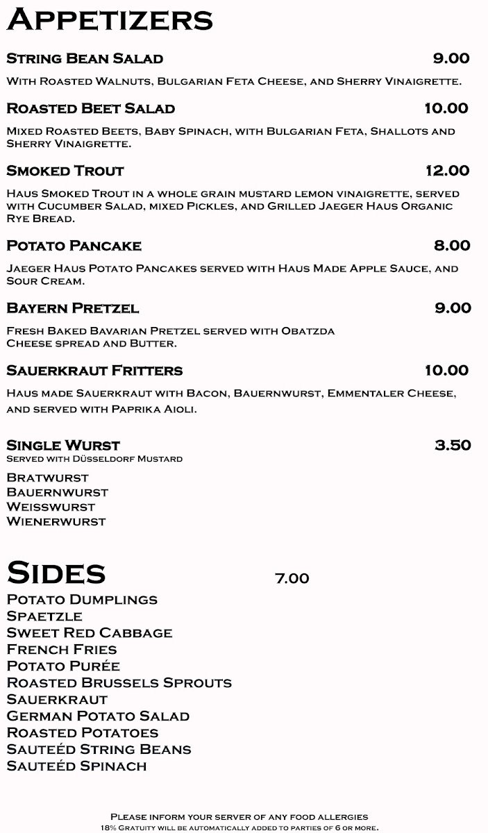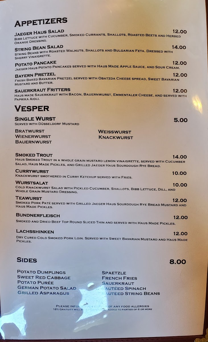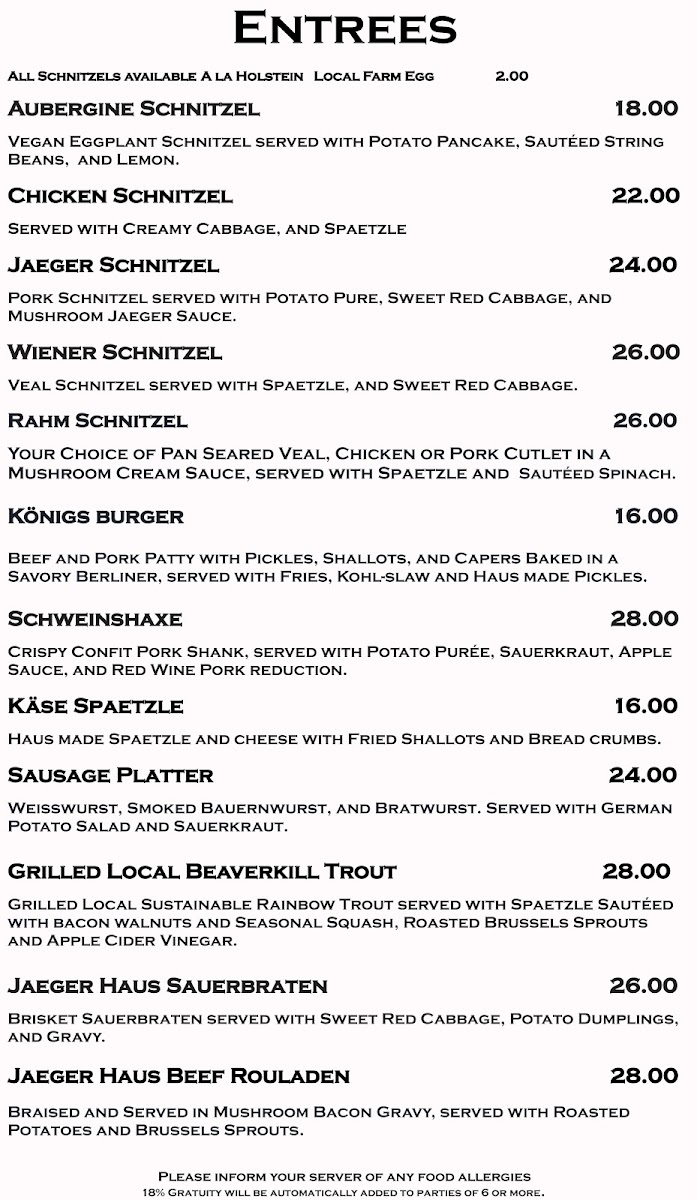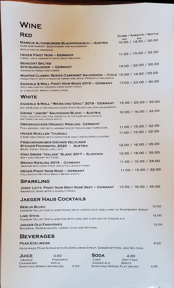 Jaeger Haus Menu